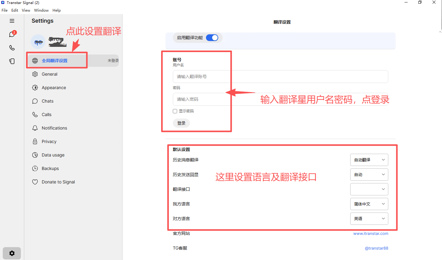 3)进入全局翻译设置,并登录Transtar账号,进行翻译设置。