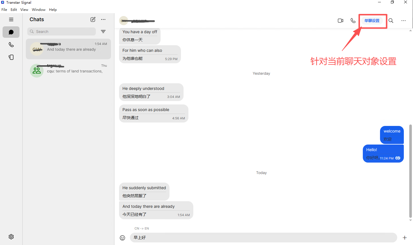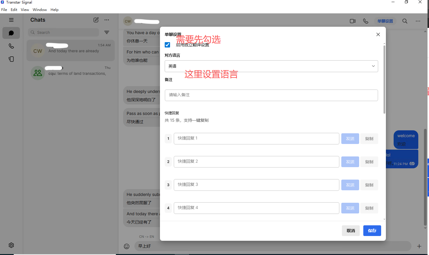5)单聊设置,可针对特定用户设置翻译语言。比如全局设置为英文,而当前用户是阿拉伯语,可将当前用户的翻译语种设置为阿拉伯语。